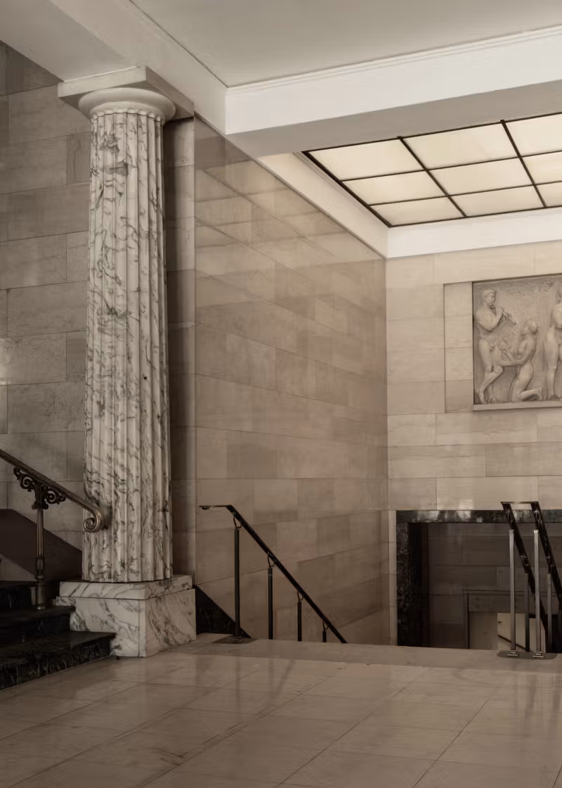 When Landmandsbanken purchased the property in 1872, it soon outgrew the space and, just 16 years later, acquired and demolished the neighboring classical townhouse — then only about 80 years old — to make room for a savings bank branch and a boardroom. Architect H.B. Storck was commissioned to design an Italian Renaissance-style extension, lavishly decorated with a wide array of natural stones, colorful finishes, and ornamental details — a striking contrast to Harsdorff’s restrained Nordic classicism.